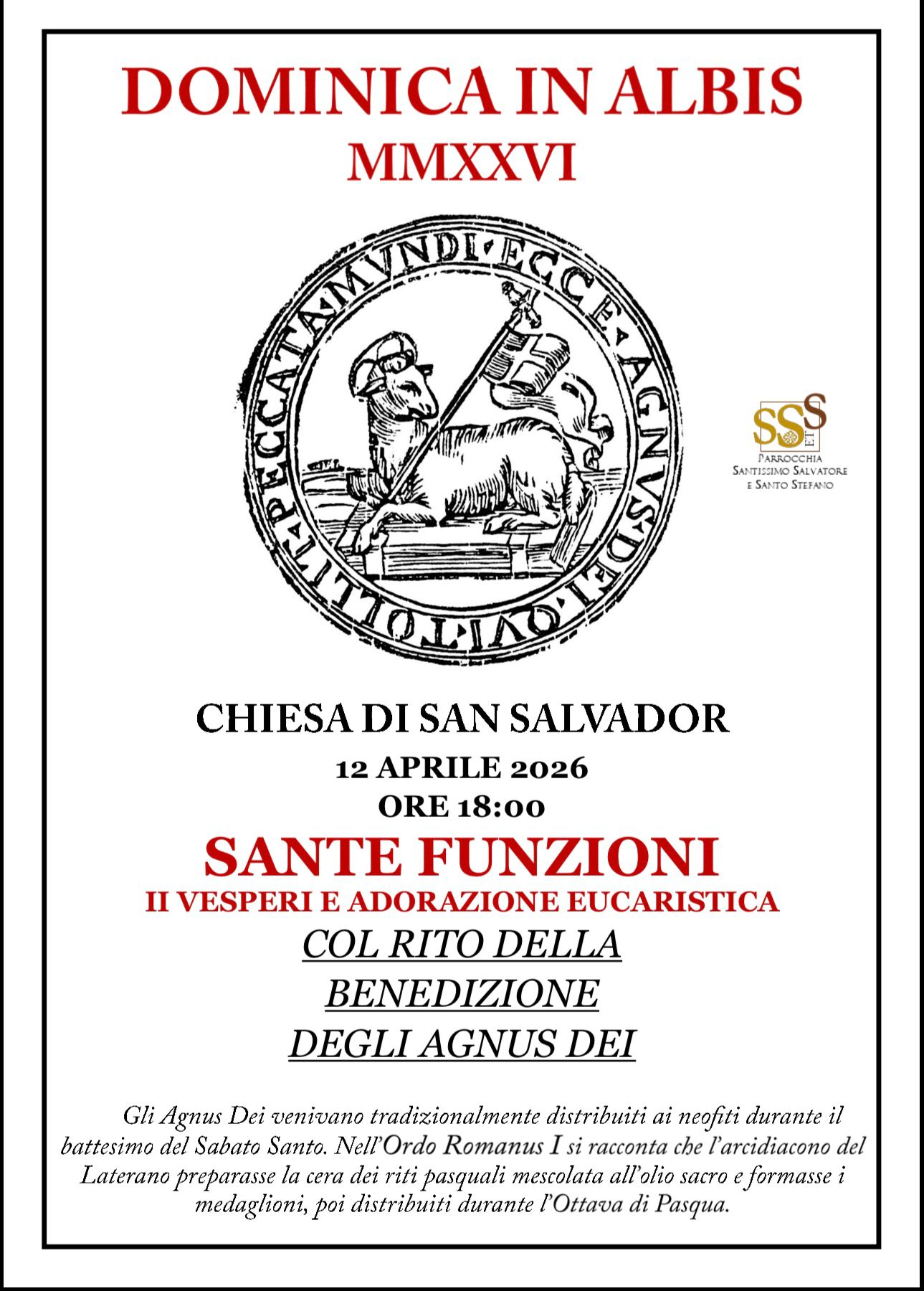 nella luce santa dell’Ottava di Pasqua, domenica 12 aprile alle ore 18.00, nella chiesa di San Salvador, celebreremo i Secondi Vespri e l’Adorazione eucaristica con il rito della benedizione degli Agnus Dei.