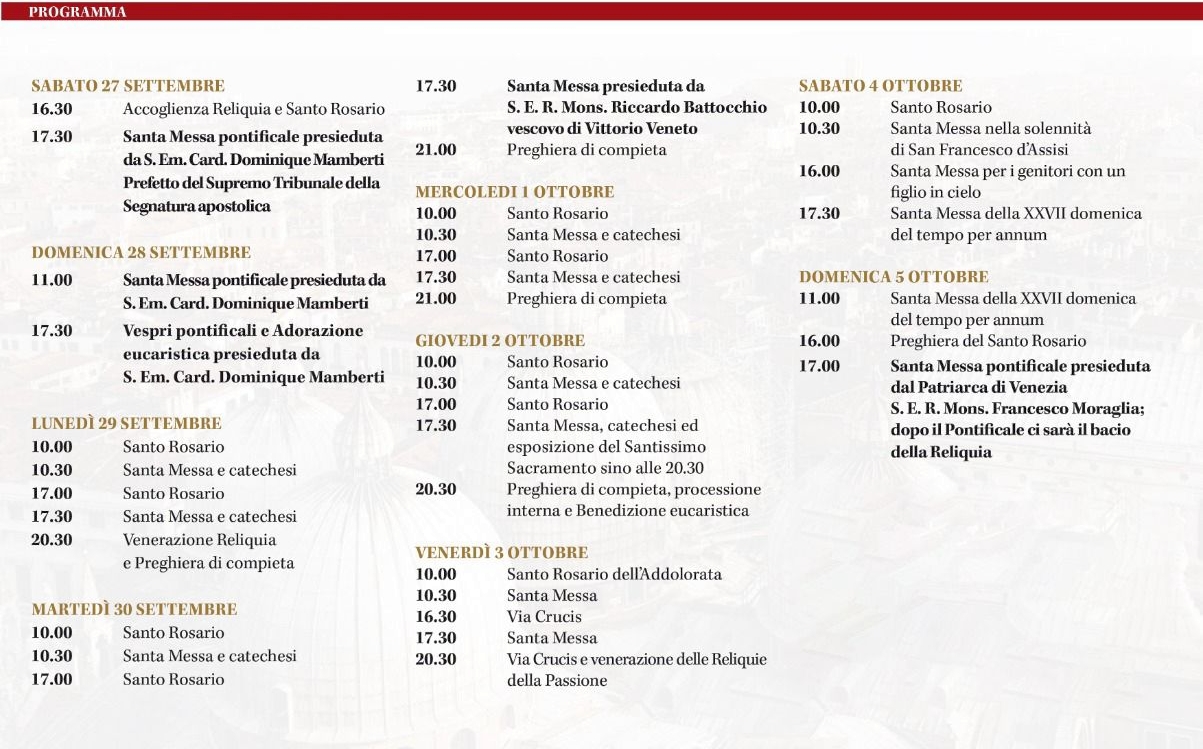 Carissimi, con gioia vi annunciamo che, dal 27 settembre al 5 ottobre, le nostre chiese di San Salvador e Santo Stefano ospiteranno un evento di straordinaria grazia: l’arrivo della reliquia della Santa Casa di Nazareth, proveniente da Nazareth (Israele), accompagnata dai frati custodi del Santuario della Santa Casa di Nazareth. Questa visita fa parte del pellegrinaggio internazionale Maria Pellegrina di Speranza, che sta attraversando le diocesi del mondo per ravvivare la devozione mariana e sensibilizzare alla difficile situazione della Terra Santa, martoriata dalla guerra e dall’instabilità. La Santa Casa è la casa dell’ Eccomi, la dimora dell’Annunciazione, il luogo in cui il Verbo si è fatto carne. Avere tra noi questo segno concreto è dono e provocazione, è consolazione e appello: Maria viene a visitarci, a portare pace e rinnovare la speranza. Durante la settimana sono previsti momenti di preghiera, adorazione, liturgie, catechesi mariane, incontri per famiglie e giovani, veglie e processioni, in un clima di silenzio e ascolto. Vi invitiamo a segnare le date del programma sotto riportato, a partecipare numerosi e a diffondere questa notizia in famiglia, in parrocchia, tra gli amici: Maria viene davvero a casa nostra. Accogliamola.