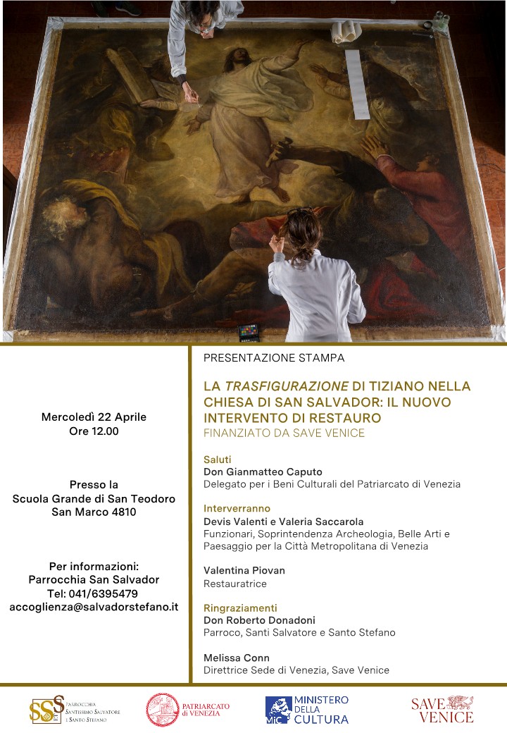 La Trasfigurazione di Tiziano nella chiesa di San Salvador: si terrà una presentazione del progetto mercoledì 22 aprile 2026 alle ore 12.00, presso la Scuola Grande di San Teodoro a Venezia.
