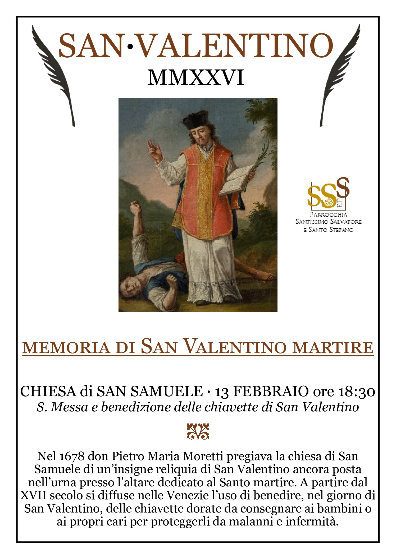Nel 1678 don Pietro Maria Moretti pregiava la chiesa di San Samuele di un’insigne reliquia di San Valentino ancora posta nell’urna presso l’altare dedicato al Santo martire. A partire dal XVII secolo si diffuse nelle Venezie l’uso di benedire, nel giorno di San Valentino, delle chiavette dorate da consegnare ai bambini o ai propri cari per proteggerli da malanni e infermità.